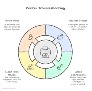 If colors look strange, run a head cleaning or alignment tool. Avoid forcing parts open or closed, as this can break them. Smart troubleshooting keeps Photo printing printers safe and working longer.